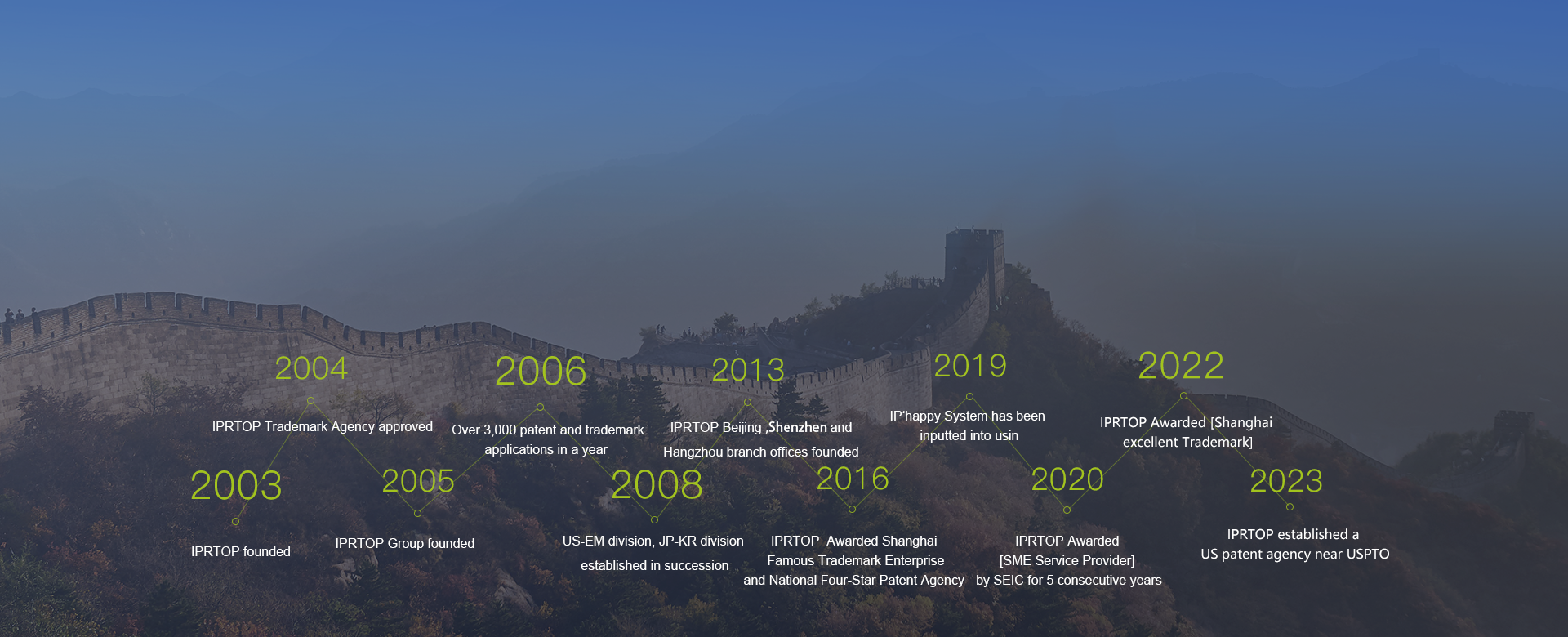 IPRTOP Patent and Trademark Law Office is one of the famous service brands in domestic IP community. It is a professional organization which can independently accomplish various IP related services. IPRTOP was designated by the Shanghai World Expo Business Coordinated Bureau as "A Service Supplier recommended by Expo 2010 Shanghai China". In 2015, JZMC was designated as Three-Star Patent Agency in China. In 2016, IPRTOP was a well-known trademark agency in Shanghai. In 2017, IPRTOP is designated as Four-Star Patent Agency in China.