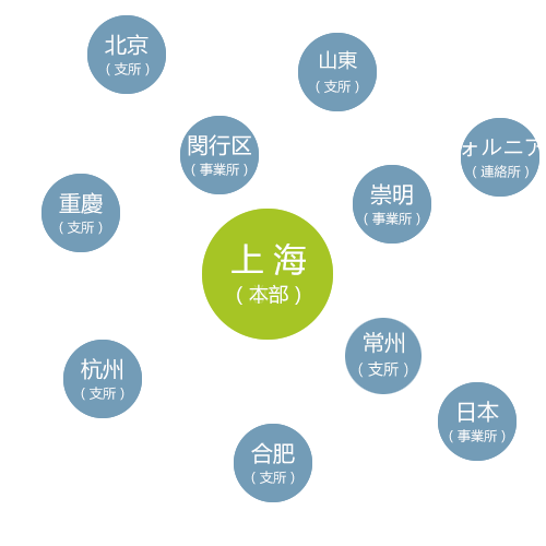 現在、漢之光華は上海の閔行區と崇明區に事業所を、重慶、済南、合肥、北京、杭州に支所を、米國カリフォルニアに連絡所を設立し、米國、歐州、日本等の皆さまと密な協力関係を構築しています。