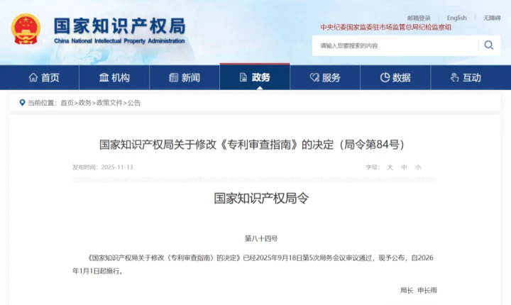 國家知識產權局發布局令第84號,對《專利審查指南》作出修改,自2026年1月1日起施行。