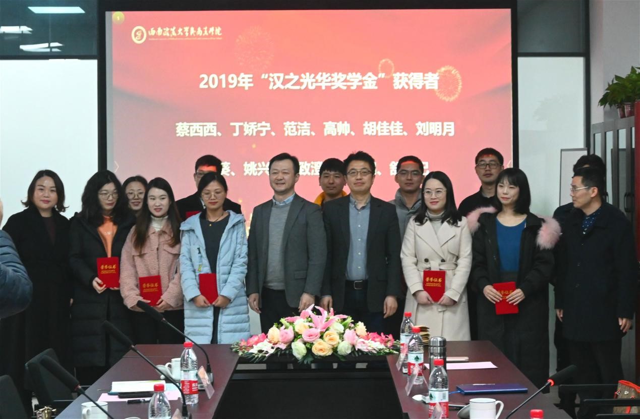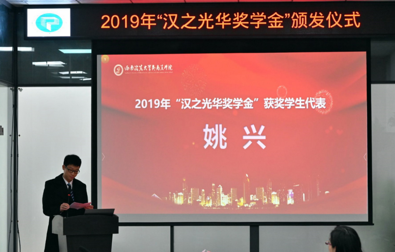 會上李雨峰院長宣讀2019年“漢之光華”獎學金表彰決定,由漢之光華代表及學院代表共同為獲獎學生頒發獲獎證書及獎金。獲獎學生代表、2017級研究生姚興代表獲獎學生進行發言。