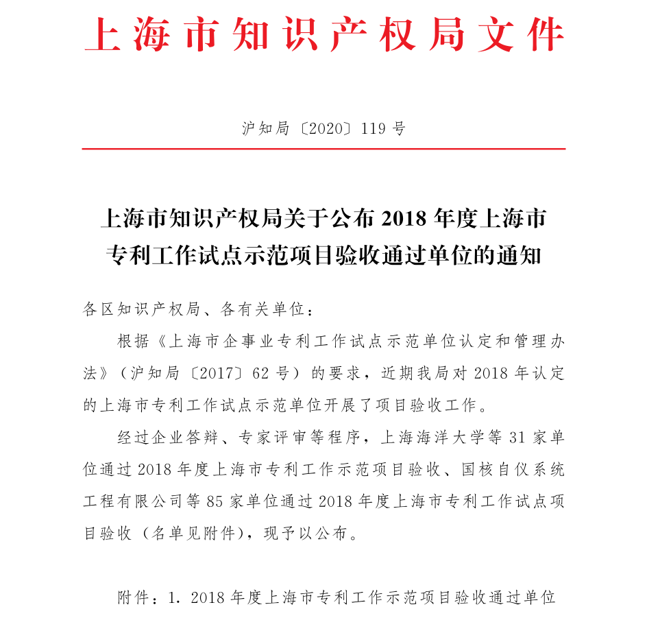 熱烈慶祝通過2018年度上海市專利工作試點(diǎn)示范項(xiàng)目驗(yàn)收單位