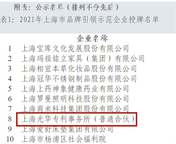 近日,經上海市經濟和信息化委員會專家綜合評議,將上海光華專利事務所(以下簡稱:光華所)等10家企業核定為2021年上海市品牌引領示范企業。