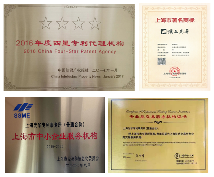 迄今為止,光華所已為國內外5200多家高科技企業,102家上市公司提供了知識產權代理、涉外業務、檢索分析咨詢業務、軟件和數據、法律服務五項專業服務。近幾年每年發明申請量4000余件,涉外知識產權申請量1300余件且為服務國內企業申請為主,近三年發明專利授權率65%,處理法律糾紛20余件,榮獲上海市著名商標單位,全國四星專利代理機構,上海市中小企業服務機構,專業類交易服務機構認定。
