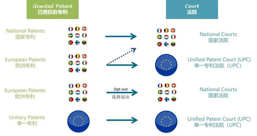 為了實(shí)現(xiàn)制度的轉(zhuǎn)換,在過渡期內(nèi),將由統(tǒng)一專利法院和國家法院進(jìn)行雙重管轄。但是,申請人可以針對目標(biāo)專利,“選擇退出”(Opt-out)統(tǒng)一專利法院的管轄[5]。具體地,在非統(tǒng)一專利體系參與國內(nèi),經(jīng)典登記歐洲專利和國家專利均由國家法院進(jìn)行管轄;在統(tǒng)一專利體系參與國內(nèi),統(tǒng)一專利將由統(tǒng)一專利法院進(jìn)行專屬管轄;在統(tǒng)一專利體系參與國內(nèi),生效的歐洲專利由統(tǒng)一專利法院和國家法院共同進(jìn)行管轄;在統(tǒng)一專利體系參與國內(nèi),“選擇退出”的經(jīng)典登記途徑生效的歐洲專利由國家法院進(jìn)行管轄。