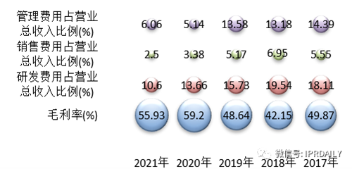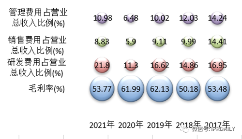眾所周知,技術壁壘所帶來的高額利潤,必然是非制冷紅外探測器研發投資的持續動力。以下根據睿創微納(688002.SH)、大立科技(002214.SZ)、高德紅外(002414.SZ)三家上市公司的年報數據,得出近5年的毛利率普遍在50%以上,個別年份可達60%以上。從各費用占比看,其研發費用大多為其他費用占比的2倍。可見具有高技術壁壘的高科技公司,為了保持公司的技術優勢,進一步提升公司的技術實力,提高競爭力,也必須在研發上持續高投入。具體數據見圖 1、圖 2、圖 3。