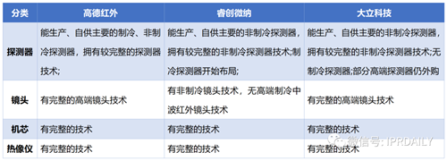 非制冷熱成像的核心技術是非制冷紅外芯片的設計、制造和探測器的封裝測試。下游的終端產品成像儀和光電系統以及相應的圖像處理軟件等是隨著探測器芯片的發展而發展的,下游技術也是沒有太多技術壁壘的技術領域。單從是否有制冷型探測器的研發和批量產品來看,就可以獲知高德紅外所具有的技術壁壘最高、其次是睿創微納,最后才是大立科技。