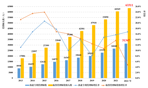 2013-2022年執(zhí)業(yè)專利代理師及取得專利代理師資格人數(shù)變化情況