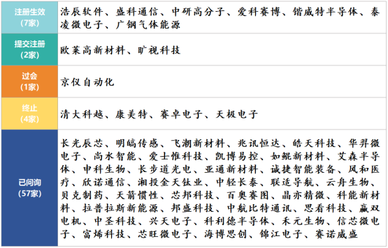 截止到2023年07月28日,科創板共計申報企業934家。其中注冊生效568家,終止(包括終止、終止注冊、不予注冊)239家,審核中(包括已受理、已問詢、上市委會議通過、提交注冊)119家,暫緩審議或中止8家。