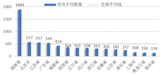 從地區平均專利量的角度來看,如圖4所示,高于全國平均專利申請量(510件)的地區有4個,依次為:湖南省(1894件)、北京市(577件)、江蘇省(557件)、廣東省(544件),其中,株洲中車時代電氣股份有限公司、中國鐵建重工集團股份有限公司兩家頭部企業注冊地位于湖南省,使湖南省躍居地區平均專利數量的首位。