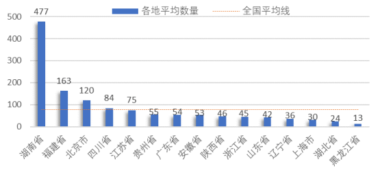 從地區平均高價值有效中國發明專利量的角度來看,如圖7,高于全國平均水平(78件)的地區有4個,依次為:湖南省(477件)、福建省(163件)、北京市(120件)、四川省(84件),地區擁有高于全國平均水平的高價值專利數量,對打造地區產業集群發展有積極的影響帶動作用。