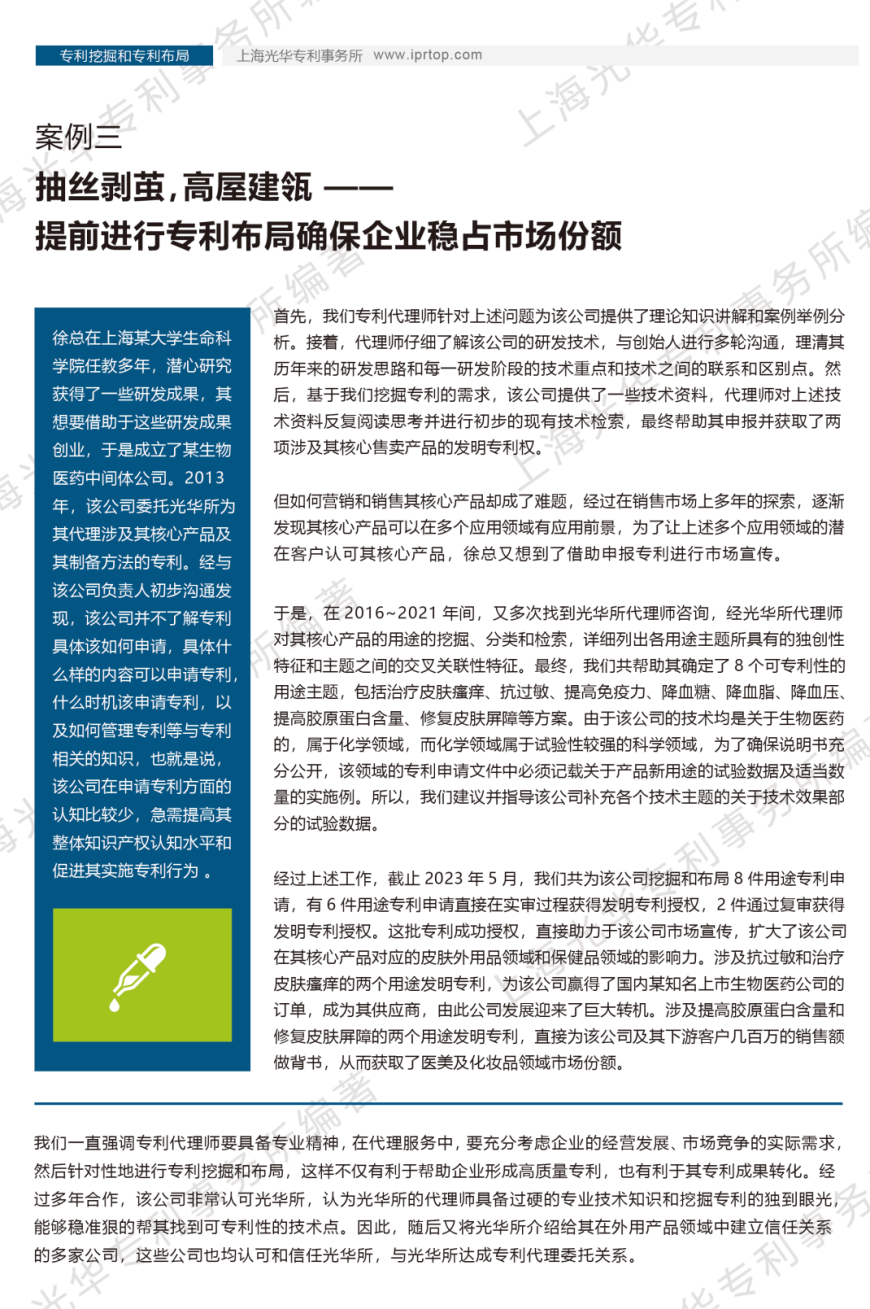案例三表明:在代理服務中,要充分考慮企業的經營發展、市場競爭的實際需求,然后針對性地進行專利挖掘和布局,這樣不僅有利于幫助企業形成高質量專利,也有利于其專利成果轉化。