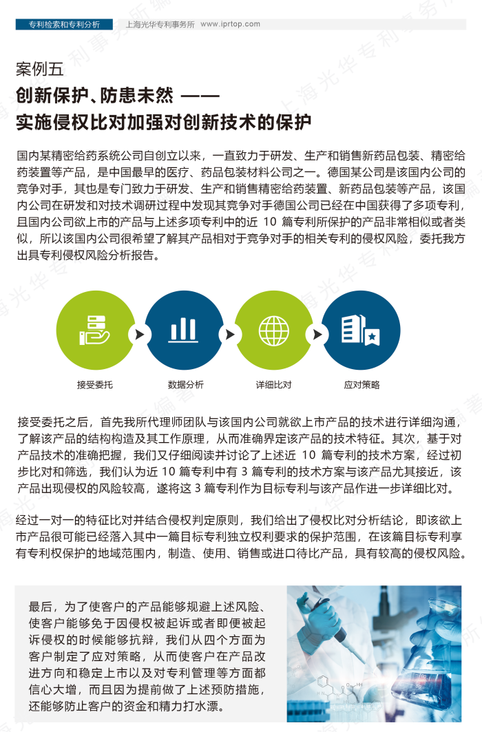 案例五從國內某精密給藥系統公司希望了解其某產品相對于競爭對相關專利的侵權風險的案例出發,闡述了做好專利侵權風險分析對于公司產品改進方向和穩定上市以及對專利管理等方面都具有重要作用。