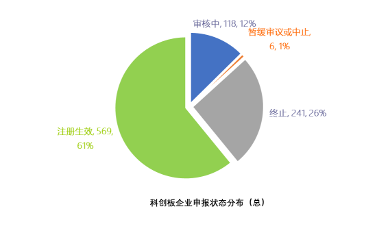 截止到2023年08月16日,科創板共計申報企業934家。其中注冊生效569家,終止(包括終止、終止注冊、不予注冊)241家,審核中(包括已受理、已問詢、上市委會議通過、提交注冊)118家,暫緩審議或中止6家。
