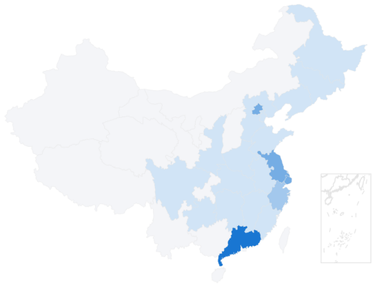 以地區為單位對高價值專利數量統計,和圖 3 省/直轄市專利申請總量及企業數量占比分布圖非常相似,高價值專利數量及企業數量占比呈現出如圖 7的分布。在各地區擁有的高價值發明專利排名中,廣東省高價值專利數量依然是第一位,達9937件;排在2-5位的地區依次為:上海市5842件、北京市5830件、江蘇省4521件、浙江省3457件。這些地區的特點是:經濟發展水平高、企業數量聚集度高,五個地區的專利數量合計占比全國總數量的80%。