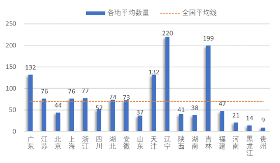 從地區平均專利量的角度來看,如圖 4所示,高于全國平均專利申請量(69.5件/專利權人)的地區有9個,依次為:廣東?。?32件)、江蘇省(76件)、上海市(76件)、浙江?。?7件件)、湖北?。?4件)、安徽?。?3件)、天津市(132件)、遼寧?。?20件)、吉林省(199件)。