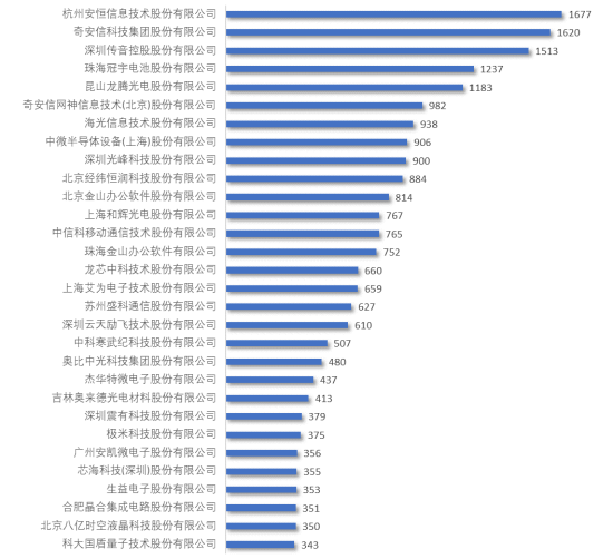 從高價值有效發明專利數量的角度來看,227家新一代信息技術領域企業擁有高價值專利數量達到3.7萬件,企業平均專利數量約為163件。如圖 5所示,杭州安恒信息技術股份有限公司以1677件高價值專利數量位居榜首;奇安信科技集團股份有限公司排在第二位,高價值發明專利數量為1620件;深圳傳音控股股份有限公司排名第三,擁有高價值發明專利數量為1513件。