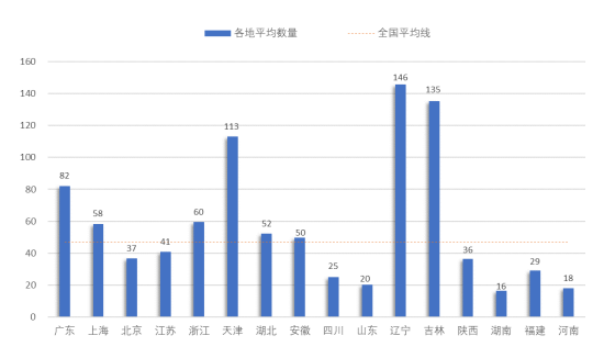 從地區平均高價值發明專利量的角度來看,如圖 8,高于全國平均水平(47件/專利權人)的地區有8個,依次為:廣東?。?2件)、上海市(58件)、浙江?。?0件)、天津市(113件)、湖北省(52件)、安徽?。?0件)、遼寧?。?46件)、吉林省(135件)。專利權人平均高價值專利申請量前三甲的省市為遼寧省、吉林省和天津市,這和圖 4 省/直轄市平均專利申請量分布圖展現的結論一樣,原因也一樣,這里不再贅述。