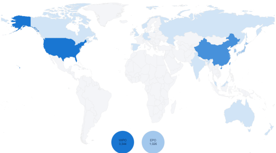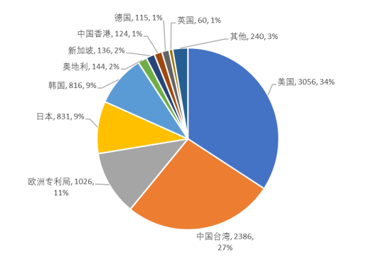 據統計,在所有的海外布局里面,共涉及31個海外官局(含PCT和EPO申請),其中第一梯隊中,PCT申請(WO)最多達3344件,然后分別是美國(US)達3056件和臺灣(TW)達2386件;在第二梯隊中歐專局(EP)1026件,日本(JP)831件,韓國(KR)816件。具體國際布局見圖 9。