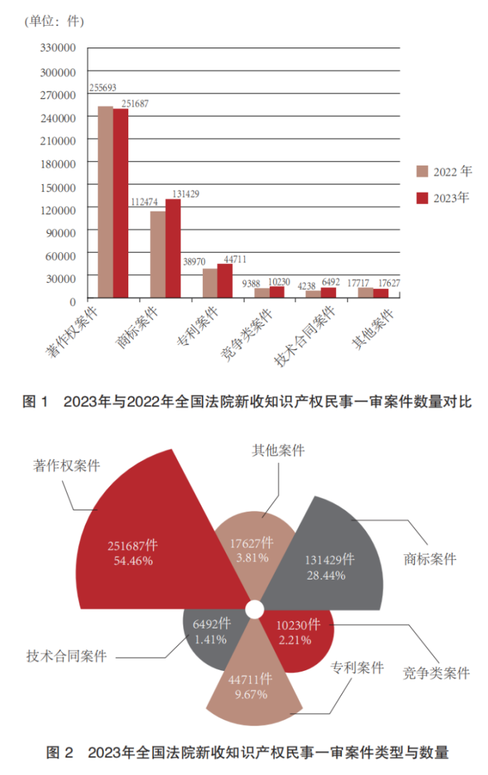 全國法院新收知識產(chǎn)權(quán)民事一審案件462176件,審結(jié)460306件,比2022年分別上升5.4%和0.55%。