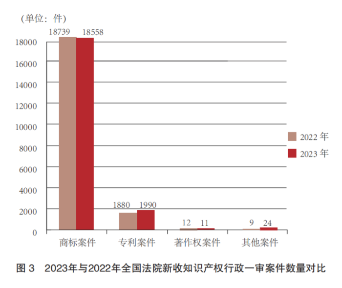 全國法院新收知識產(chǎn)權(quán)行政一審案件20583件,審結(jié)22340件,比2022年分別下降0.28%和上升26.7%。