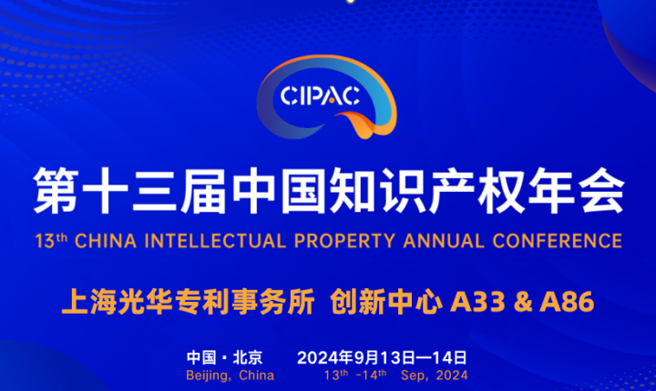 第十三屆中國知識產權年會(CIPAC)將于9月13日至14日在北京中關村國際創新中心及中關村國家自主創新示范區展示中心舉辦。今年,上海光華專利事務所將在北京中關村國際創新中心的A33及A86展位設立展臺,接待與會嘉賓,提供專業的知識產權咨詢服務,誠邀您的光臨!