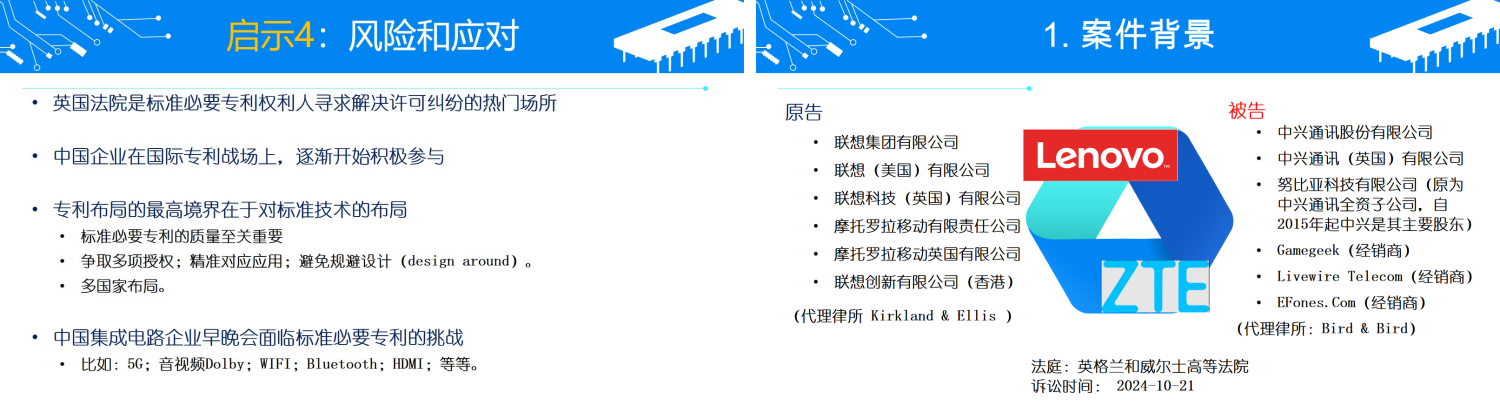 光華所合伙人/美國專利代理師/海外知識產權糾紛應對指導專家薛曉飛分享了《中興和聯想專利戰對于集成電路企業的啟示》。他從案例出發,提煉了標準必要專利、高通的SEP策略、英國法院的判決、風險應對措施四啟示,為企業提供寶貴的知識產權戰略指導。