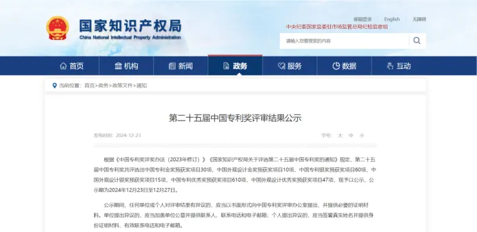 近日,國家知識產權局公布了第二十五屆中國專利獎評審結果,共評選出中國專利金獎預獲獎項目30項,中國外觀設計金獎預獲獎項目10項,中國專利銀獎預獲獎項目60項,中國外觀設計銀獎預獲獎項目15項,中國專利優秀獎預獲獎項目610項,中國外觀設計優秀獎預獲獎項目47項,現予以公示,公示期為2024年12月23日至12月27日。