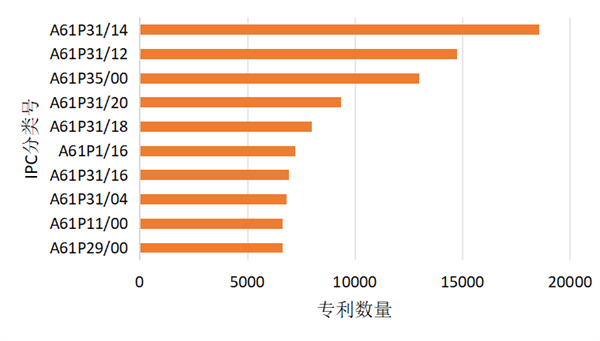 分析發現,全球專利中,抗病毒藥物著重研究RNA病毒,重點適應癥是HIV和非中樞性疾病等。與全球細分領域比例有所區別的是,中國在抗病毒藥物領域不僅注重RNA病毒藥物的研究,也重點在DNA病毒方向布局相關專利,中國在抗病毒藥物領域的研究范圍是比較廣泛的;另外,除了HIV,中國在流行性感冒或鼻病毒適應癥上的研究也比較突出。
