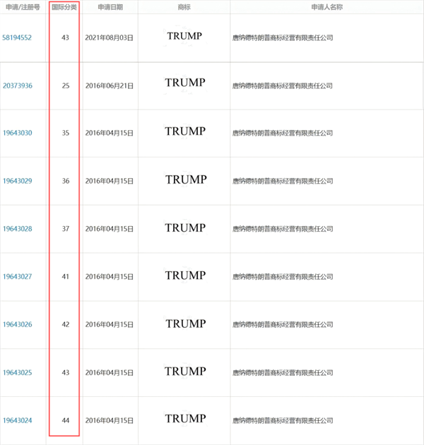 “TRUMP”商標注冊情況(圖片來源商標局)