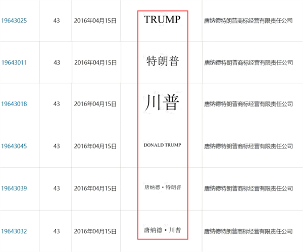 特朗普在注冊商標這件事上十分謹慎,不僅跨類別注冊了他最常見的英文名“TRUMP”,他還在同一類別分別申請了與特朗普本人高度關聯的中英文名稱,如“特朗普”“川普”“DONALD TRUMP”“唐納德·特朗普”“唐納德·川普”等,最大程度地避免被他人打擦邊球傍名牌。