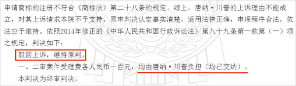 然而,即便是如此精明的商人,在商標注冊的道路上也并非一帆風順。特朗普曾遭遇過因商標近似而被駁回的事件。就在他準備在第37類“建筑服務”類別申請前述第5771154號“TRUMP”商標的14天前,國內已有第三人在相同類別搶先申請了“Trump”商標。這一意外的插曲導致特朗普的“TRUMP”商標在部分服務項目上被商標局駁回。盡管他進行了駁回復審并兩次上訴,但均以失敗告終,最終還需支付兩次上訴費用。