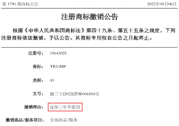 2021年,特朗普公司名下有一件注冊在第43類“餐飲住宿服務”類別的“TRUMP”商標被第三人提起撤三申請。商標局于2022年發布了該商標的撤銷公告。可見,即便是特朗普本人申請的“TRUMP”商標,沒有正當理由連續三年不使用,同樣存在被撤銷的風險。