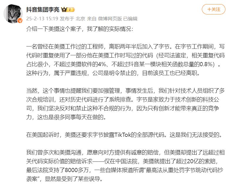 當天,抖音集團副總裁李亮在微博發文回應了此案。