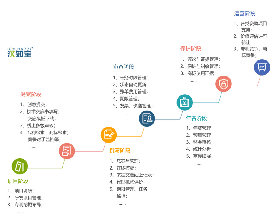漢知寶企業知識產權管理平臺,聚焦項目(產品/技術)中的知識產權,具備專業和人性化的專利、商標、軟著管理功能,從創意挖掘到申請管理各個階段,到競爭、運營階段,進行全生命周期管理;關注任務時限、年費監控等費用管理、流程管理;便利研發人員的技術交底、競爭對手監控;極大提升企業知識產權工作效率和工作能力。