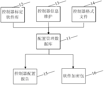 所述控制器格式文件14用以對(duì)各控制器的信息進(jìn)行設(shè)定。所述配置報(bào)告15用于對(duì)車輛診斷儀所診斷的車輛控制器、及其標(biāo)定軟件是否需要更新進(jìn)行判斷。所述標(biāo)定軟件庫12用以存儲(chǔ)所述車輛診斷儀所需的應(yīng)用軟件、標(biāo)定軟件、網(wǎng)絡(luò)軟件。所述標(biāo)定軟件庫12還設(shè)置所述配置數(shù)據(jù)庫中零件編號(hào)與該軟件包的鏈接。所述標(biāo)定加密軟件包16包含對(duì)控制器所需要的應(yīng)用軟件、標(biāo)定軟件、網(wǎng)絡(luò)軟件加密,把所述配置報(bào)告15分別發(fā)送給車輛診斷儀,更新車輛診斷儀。