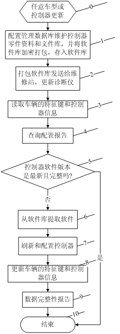 本發(fā)明的有益效果在于:本發(fā)明通過更新車輛診斷儀控制器的軟件庫來更新診斷儀控制器,能夠進(jìn)行統(tǒng)一高效地管理,提高了更新控制器配置的靈活性、完整性、嚴(yán)密性和診斷效率。適應(yīng)了車輛發(fā)展的未來需求,可持續(xù)對(duì)復(fù)雜程度日益增長(zhǎng)的車輛的控制器進(jìn)行完整、快速地配置。